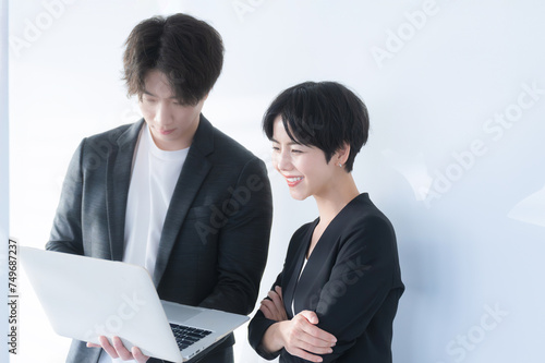 Smiling businesswoman with computer in backlight and upper body of businessman Image of conversation such as looking at documents together