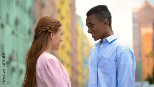 Smiling couple of teenagers looking at each other, meeting in city center, date