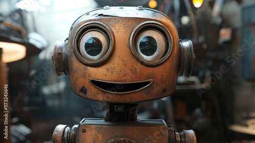 Smiling vintage robot with large eyes