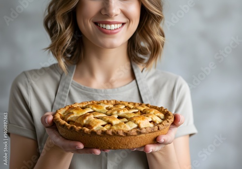 Smiling Woman Holding Fresh Baked Apple Pie, Home Baking, Pastry, Dessert, Food Concept