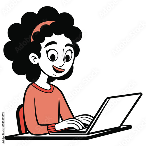Smiling young curly haired woman uses her laptop sitting at the desk