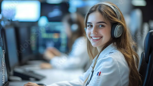 smiling young female air traffic controller working in control tower at airport, woman working, girl, flight control, airplane, control panel, professional, job, worker, screens, technology, operator
