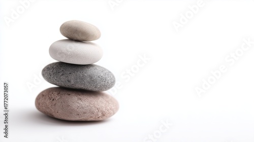 Smooth natural pebbles stack isolated on white background, zen minimalist composition, free place for text