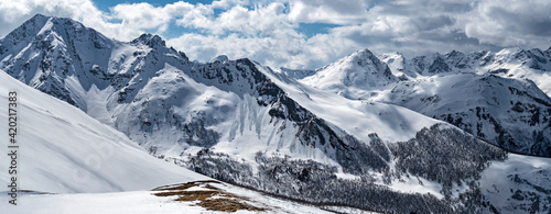 Snowcapped Caucasus mountain ridge. Winter landscape in Arkhyz (Karachay-Cherkessia, Russia)