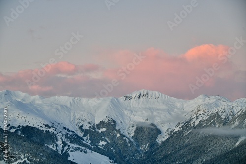 Snowcapped mountains under pink sky by sunset