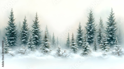 Snowy evergreen forest scene, soft light, mist