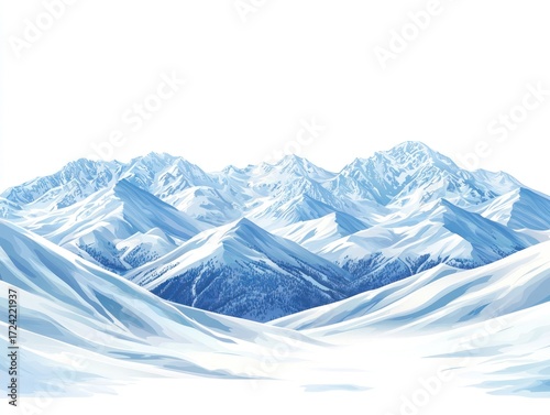 Snowy mountain range with blue hues and white backdrop in vector art