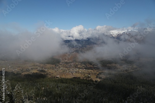 Snowy mountains covered in clouds beautified by the sky