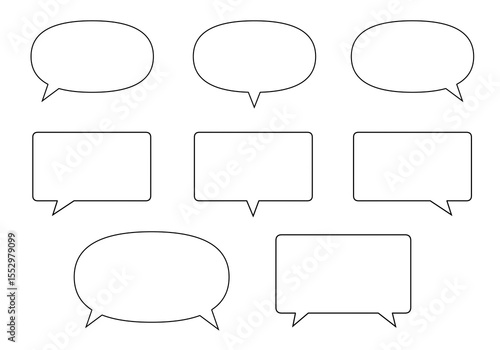 白黒のふきだしセット(線画)楕円形、長方形、角丸など複数のバリエーションがあり、吹き出しの方向も左右下と多様です。漫画、プレゼン資料、SNS投稿、動画編集などに幅広く活用できます。背景は透過処理済み。