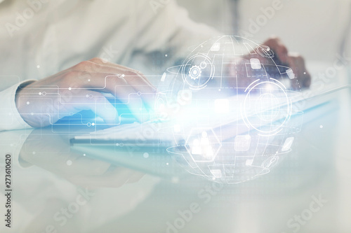 Social network theme hologram with businessman working on computer on background. Multi exposure.
