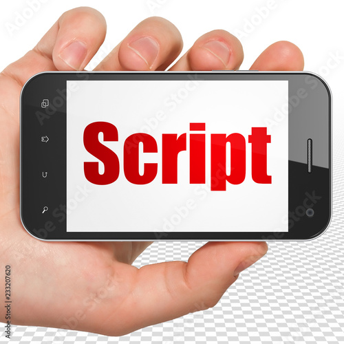 Software concept: Hand Holding Smartphone with red text Script on display, 3D rendering