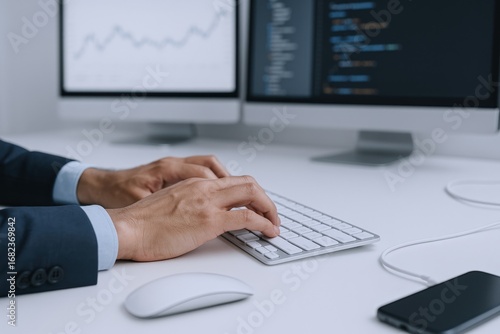 Software Developer Coding with Dual Monitors Demonstrating Stock Analysis and Mobile Application Development
