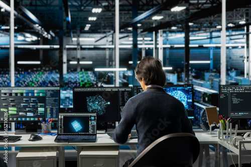 Software developer in data center using PC, managing AI training datasets. IT employee using computer program to oversee machine learning in server room supporting scalable infrastructure for AI apps