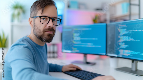Software developer wearing glasses is working on dual monitors displaying lines of code.