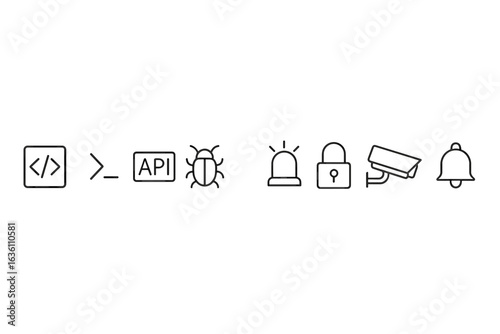 Software development and cybersecurity icons: code, command, api, bug, alert, lock, security camera, bell