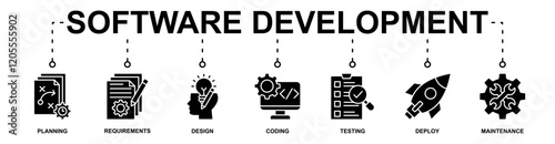 Software Development banner web icon vector illustration concept with icon of planning, requirements, design, coding, testing, deploy, maintenance