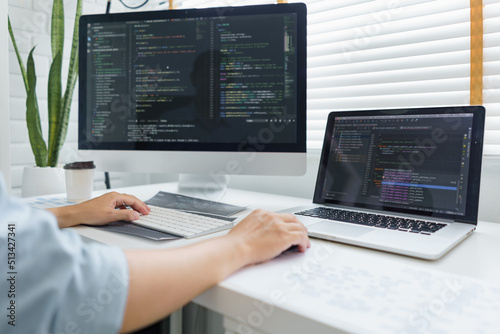 Software development concept, Male programmer typing data code on laptop to develop app and website