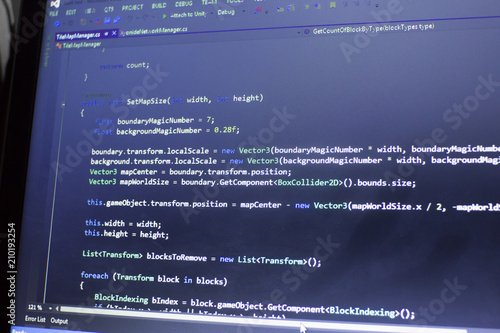 Software development C-Sharp (C#, .NET) code. Abstract information technology modern background. Developing network multiplayer game in IDE. Lines of high-level API code. Screen of game developer.