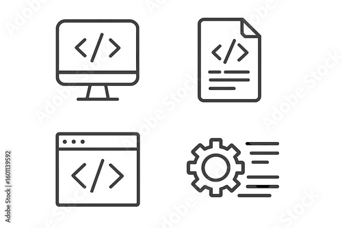 Software development line icon set. Web programming, coding, and computer engineering concepts. Vector icons for frontend, backend, API, and application technology.