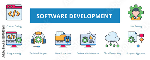 Software Development Lineal Color Banner Web Icon Set Vector Illustration, Coding Programming Technical Support Data Protection Software Maintenance Cloud Computing Program Algorithm User Setting
