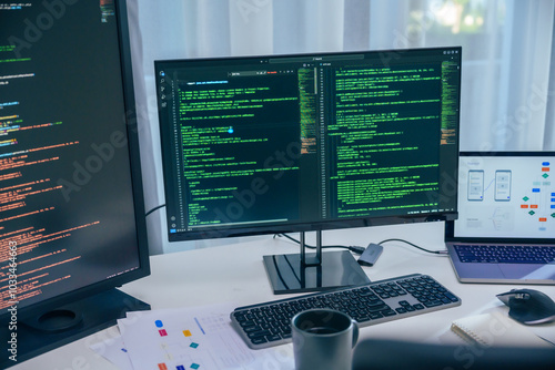 Software development office Workstation setup with multiple monitors displaying code and development diagrams during a nighttime coding session