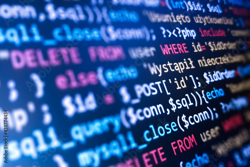 Software development pattern. Programmer monitor with php language code. Closeup tablet screen technology background