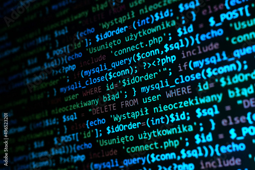 Software development pattern. Programmer monitor with php language code. Closeup tablet screen technology background