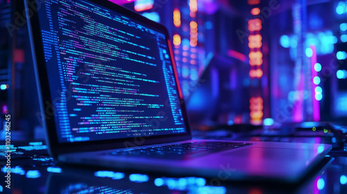Software development. Programming, coding and software testing on laptop. Laptop hanging over table with program code on the screen. Digital Computer technology isometric background concept.