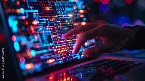 Software engineer coding on a laptop, with a futuristic interface showing circuit board elements and programming code.
