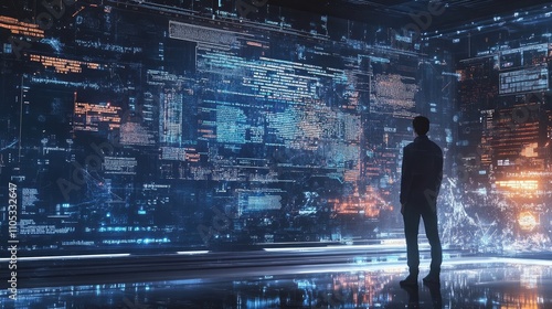 Software engineer viewing complex code and big data analytics on screen