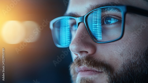 Software Programmer developing new software in a modern office, focusing on coding lines.
