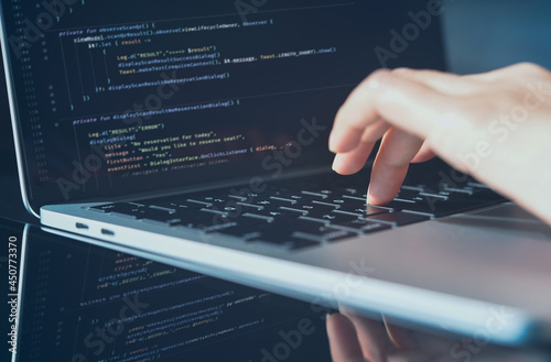 Software technology development concept. Woman programmer, software engineer coding computer script on laptop