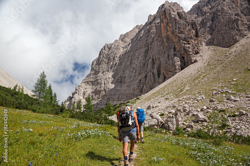 Some hikers walk along a mountain path.