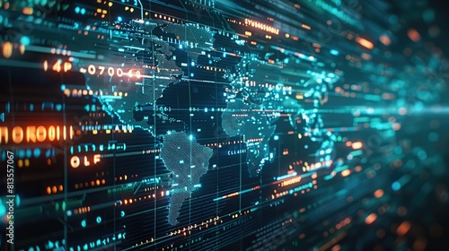 Some kind of computer program code running across the screen and superimposed on a world map. Generative AI.