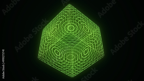 Space futuristic cube. Network connection structure cyberspace with moving particles and lines. Blockchain cube. Big data visualization. Abstract cyber security background. 3D rendering.