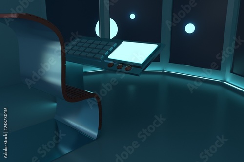 Spaceship interior. Cockpit with computer and space view. 3d rendering