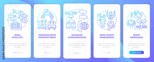 Spacetech trends blue gradient onboarding mobile app screen. Innovations walkthrough 5 steps graphic instructions pages with linear concepts. UI, UX, GUI template. Myriad Pro-Bold, Regular fonts used