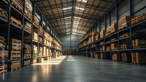 Spacious warehouse interior showcasing organized pallets and efficient storage solutions under natural light.