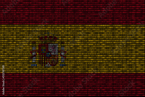 Spain flag superimposed on duplicate computer code that permeates each other. The matrix-like binary code consists of 0s and 1s and has a vertical position.