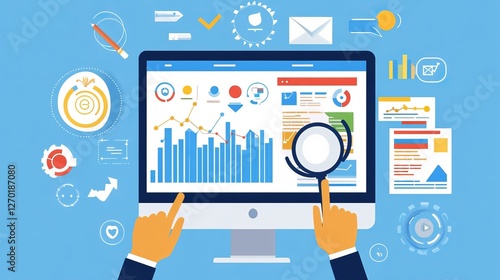 Specialist analyzing website traffic data on computer screen, interpreting digital marketing analytics to optimize search rankings, improve online visibility, and enhance web performance for effective