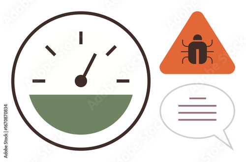 Speedometer gauge indicating performance, warning triangle with bug, and speech bubble with text representing error detection, troubleshooting, optimization, and efficient problem-solving. Ideal