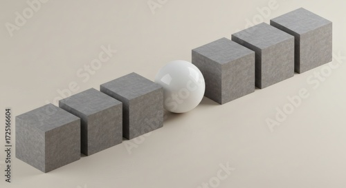 Sphere Breaks Pattern Gray Cubes White Orb in Simple Arrangement.
