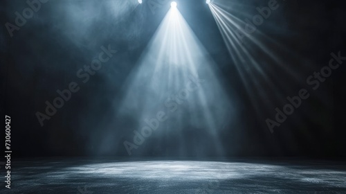 Spotlights cast their beams onto an empty stage against a dark background, atmosphere of anticipation and potential for performance or presentation.