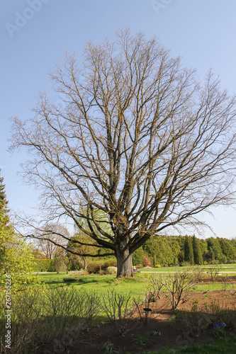 Spring landscape in botanical garden. Large tree