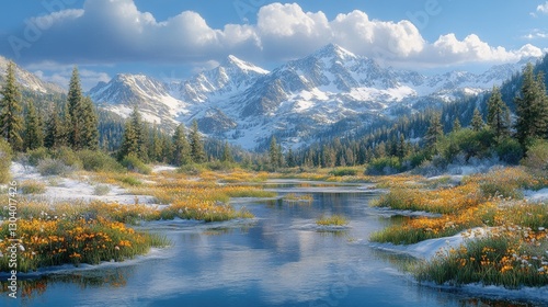 Spring Meadow Reflecting Snowy Mountains