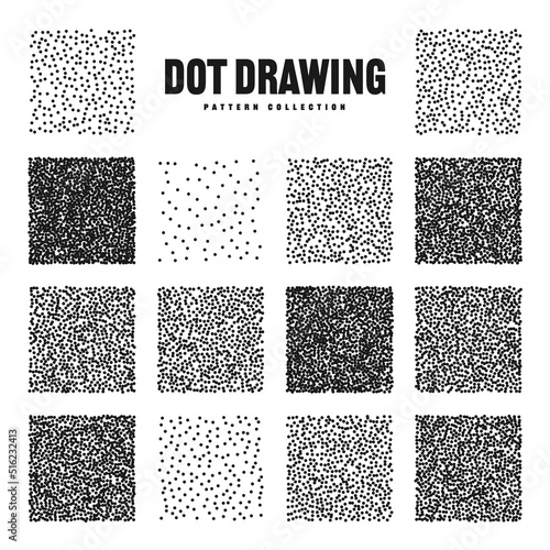 Square shaped dotted objects, stipple elements. Stippling, dotwork drawing, shading using dots. Pixel disintegration, halftone effect. White noise grainy texture, pattern. Vector illustration