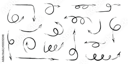 Squiggly black arrow set in flat style. Hand drawn crayon chalk elements. Doodle movement spiral lines. Pencil brush arrows for icon, sketch, texture. Children vector illustration on white background.