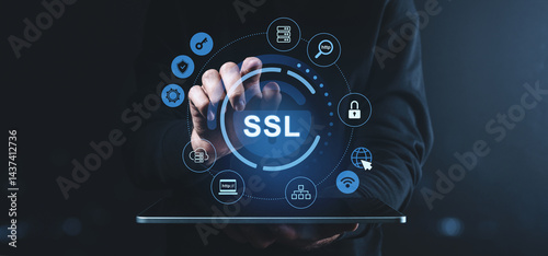 SSL security interface with icons on virtual screen over tablet in dark setting.