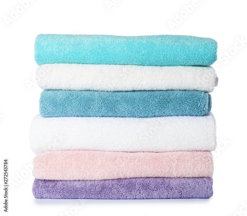 Stack of folded towels on white background