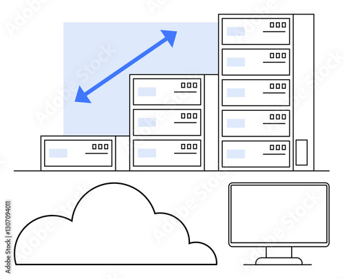 Stack of servers with growth arrow, cloud symbol, monitor. Ideal for cloud computing, scalability, data storage, technology, IT solutions digital transformation web hosting. Flat simple metaphor